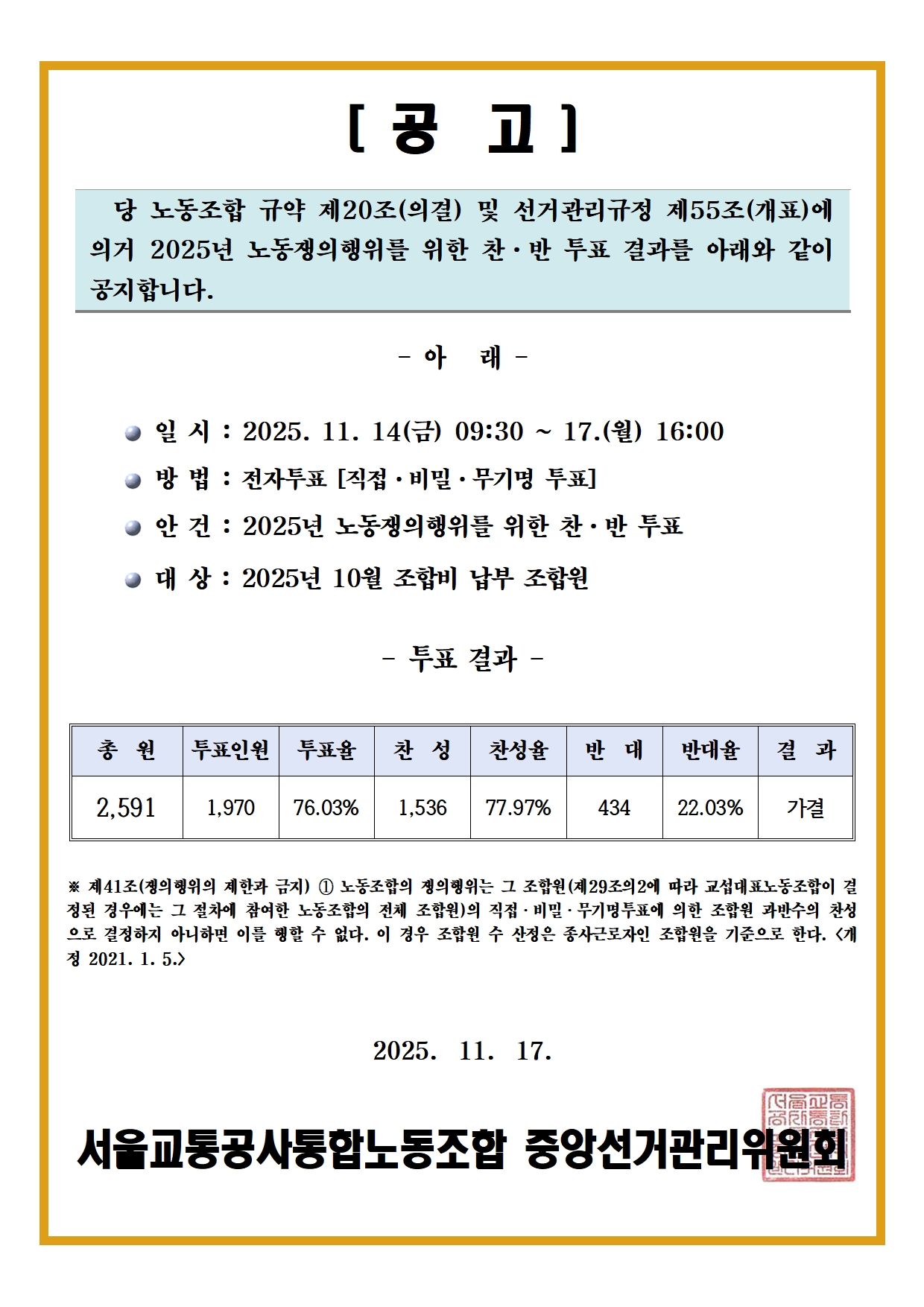 [공 고] 2025년 노동쟁의행위 찬반 투표 결과
