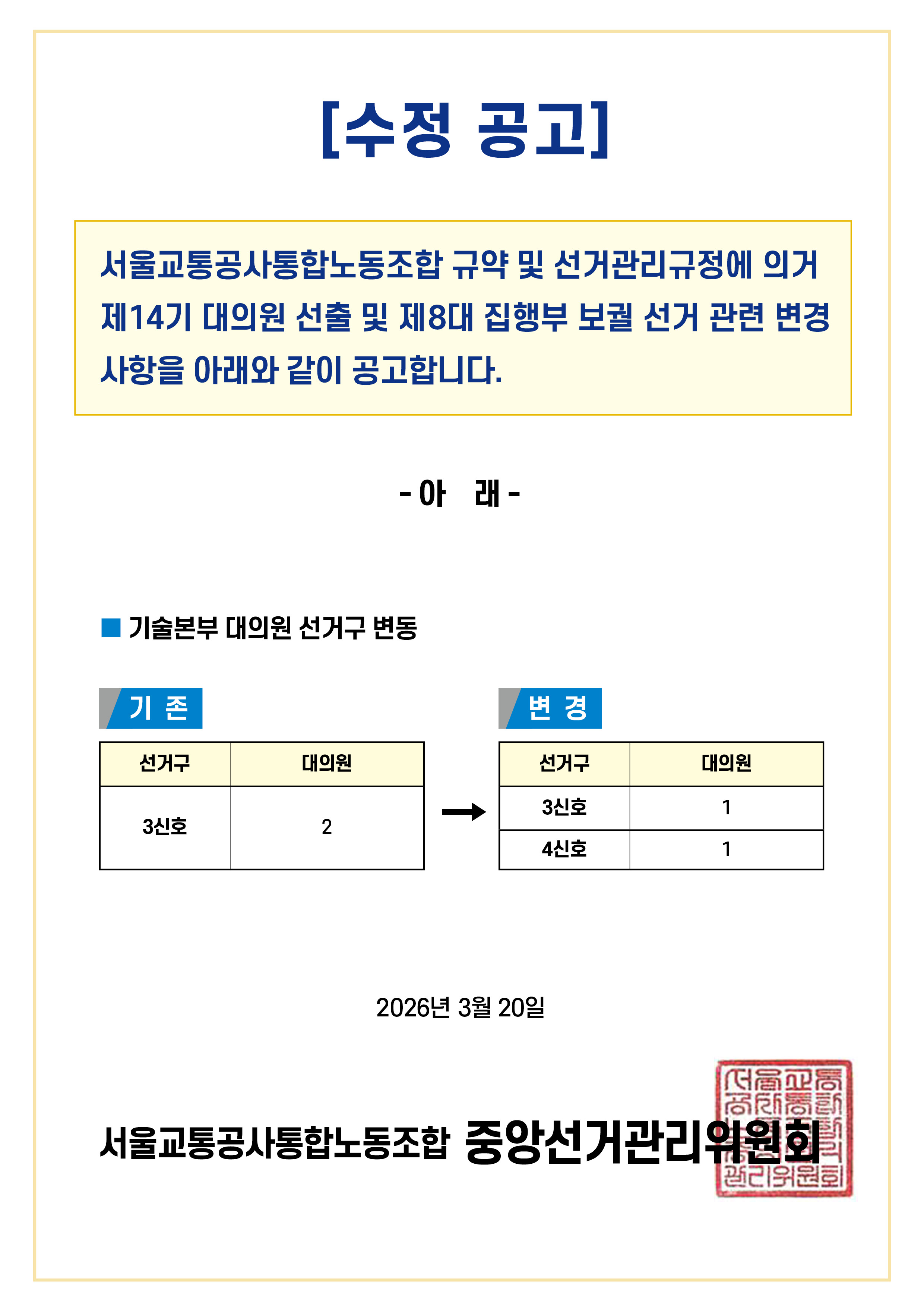 [수정 공고] 제14기 대의원 선출 및 제8대 집행부 보궐선거 관련 변경사항