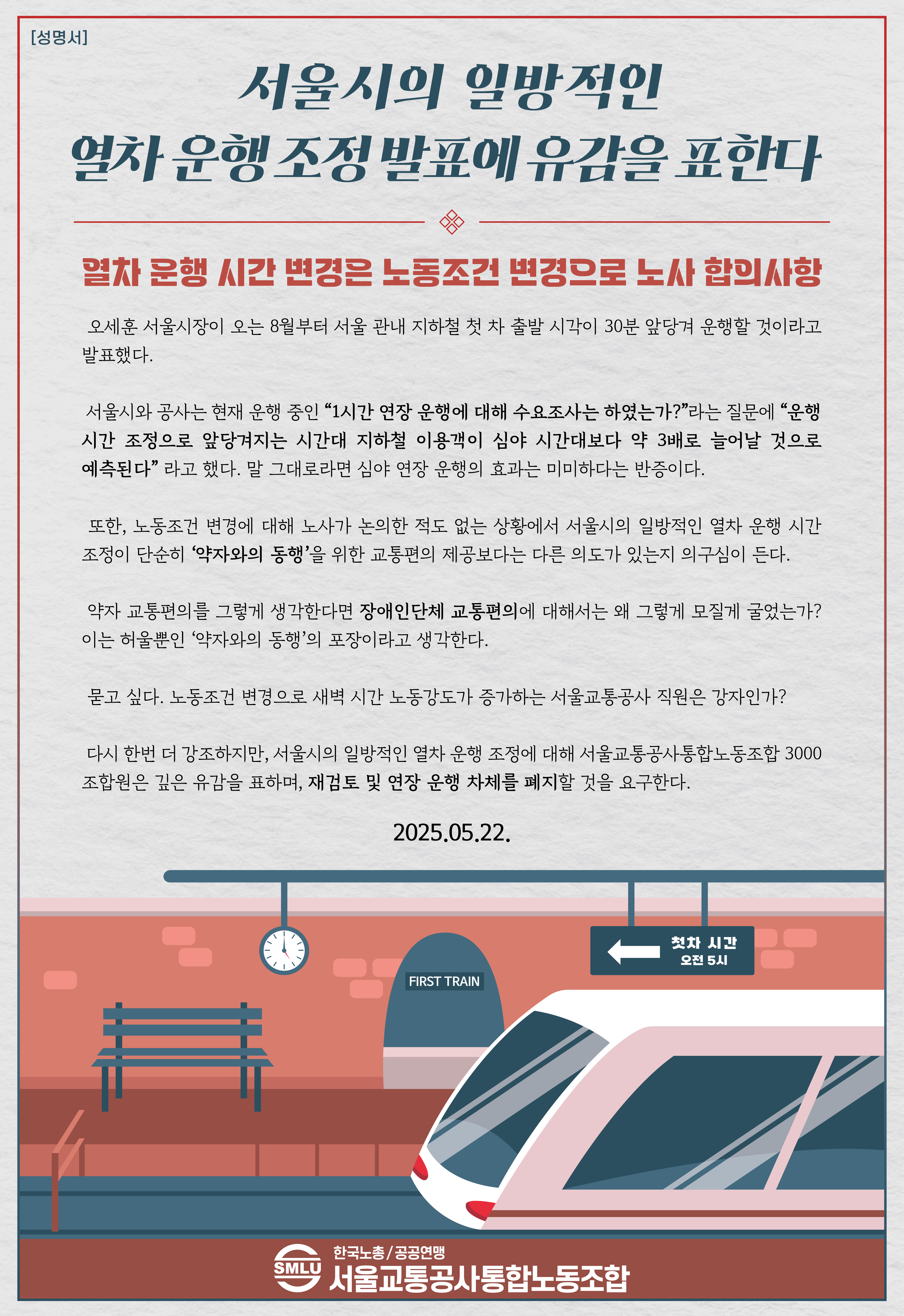 [성명서] 서울시의 일방적인 열차운행 조정발…