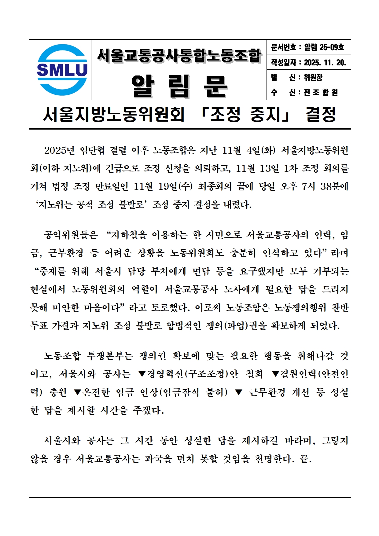 [알림문] 서울지방노동위원회 조정중지 결정