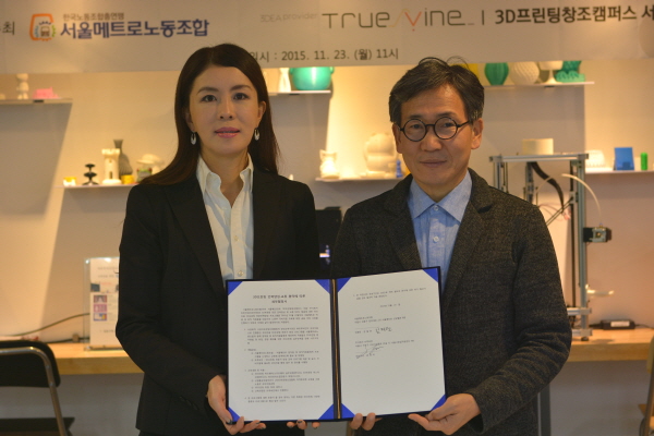 서울메트로노동조합(위원장 김철관)과 (사)3D프린팅산업협회 공인 교육기관 ㈜TRUE VINE(투르바인, 대표 공정미)은 서울메트로 임직원과 은퇴자를 위한 3D 프린팅 전문 인력양성 프로그램을 2015년 11월 23일(월) 오전 11시 서울시창업지원센터 4층에서 체결 했다.