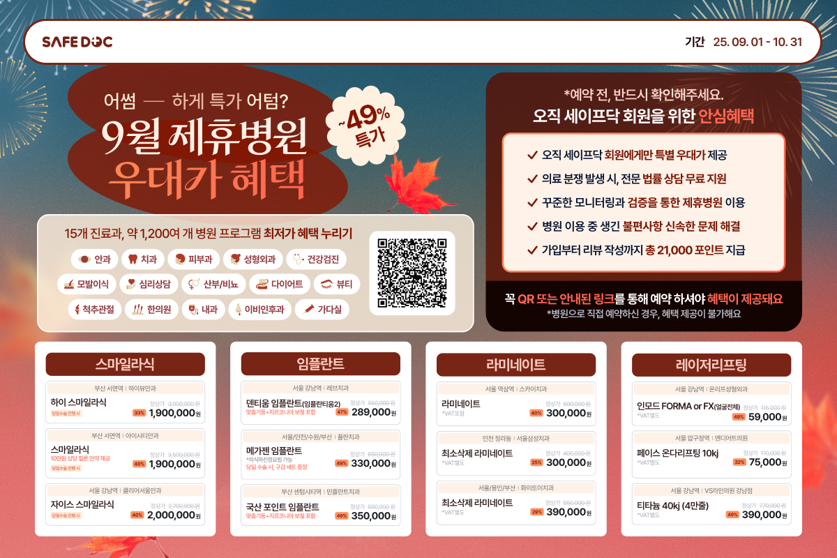 전국 500여개 병의원 비급여 의료비 진료과별 최대 49% 할인혜택(15개 진료과, 1,200여개 프로그램)