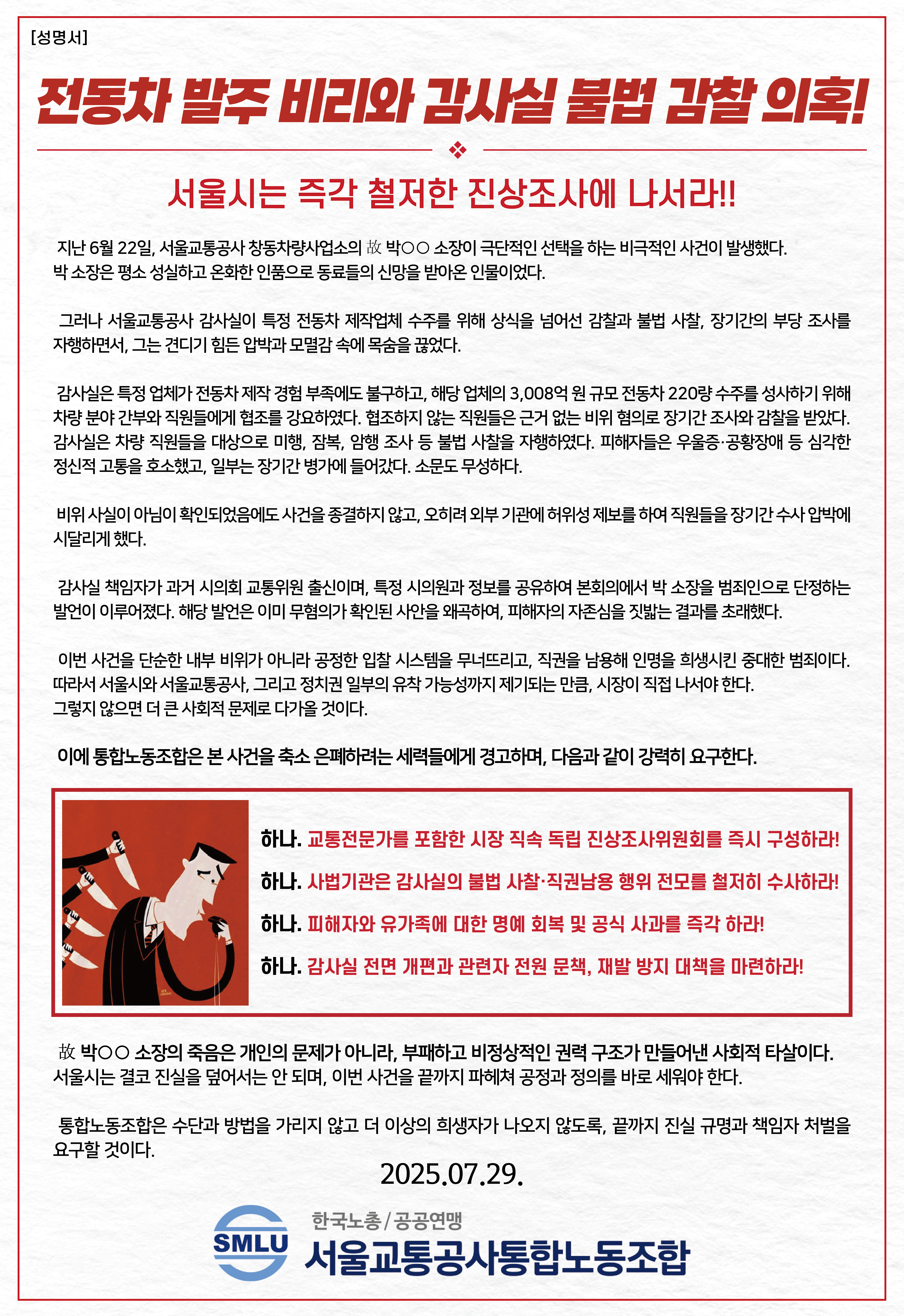 [성명서] 전동차 발주 비리와 감사실 불법 감찰 의혹!