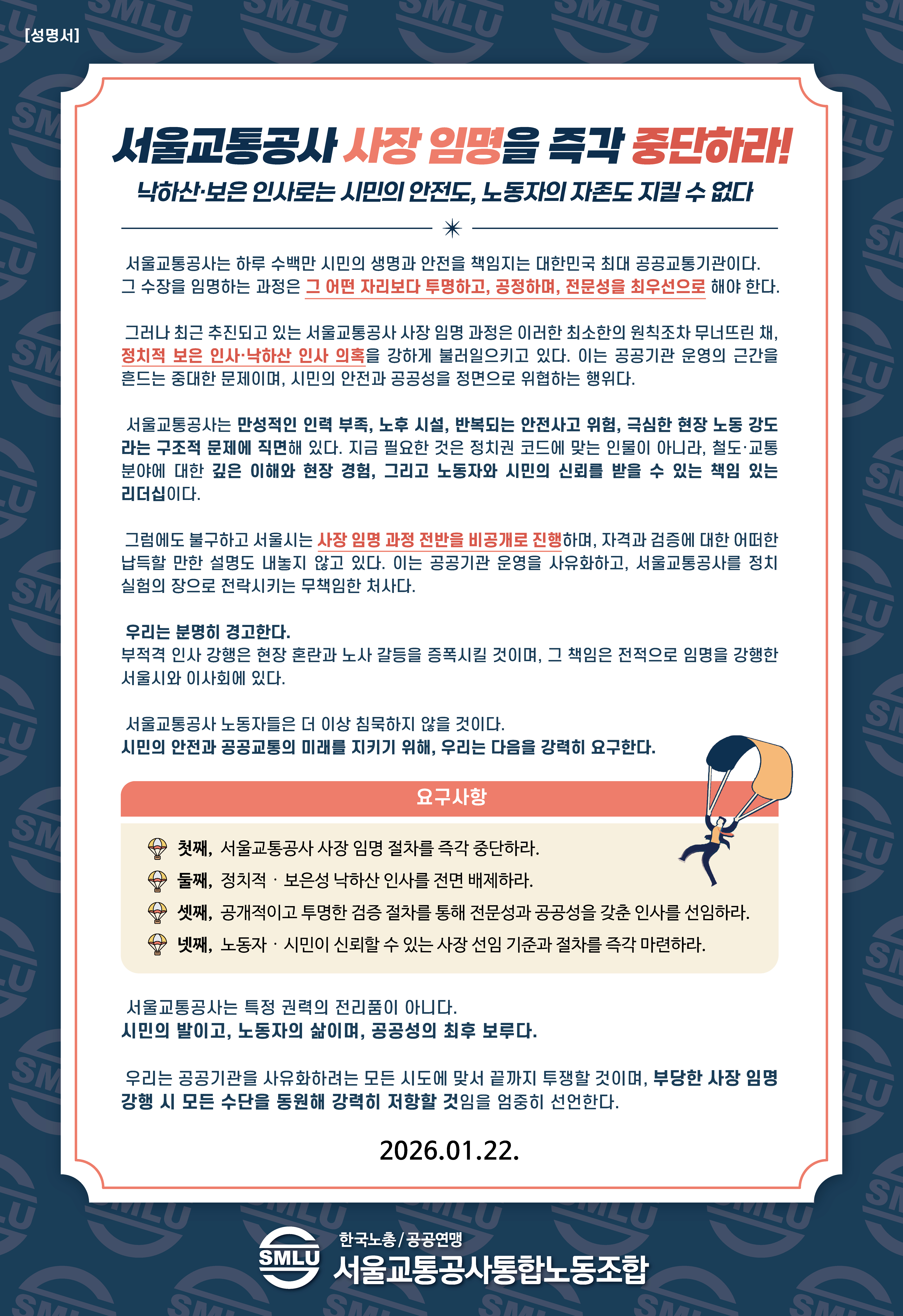 [성명서] 서울교통공사 사장 임명을 즉각 중단하라!