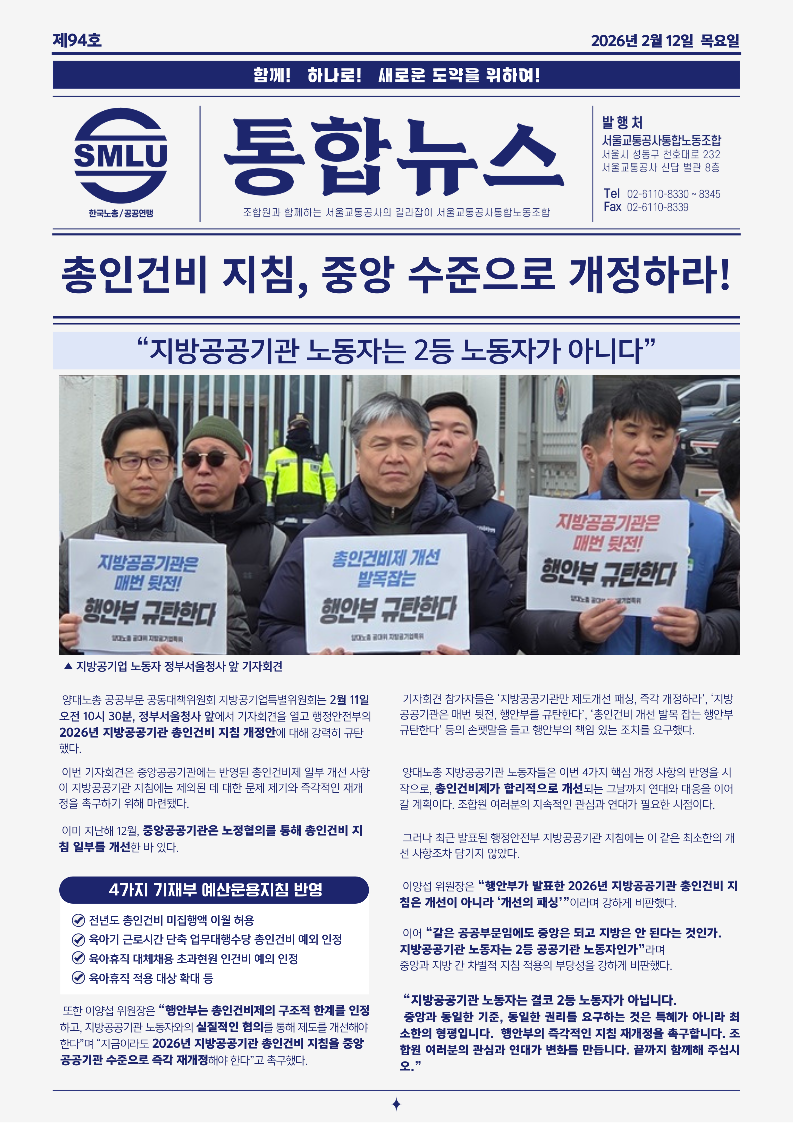 [통합뉴스 제94호] 총인건비 지침, 중앙 수준으로 개정하라!