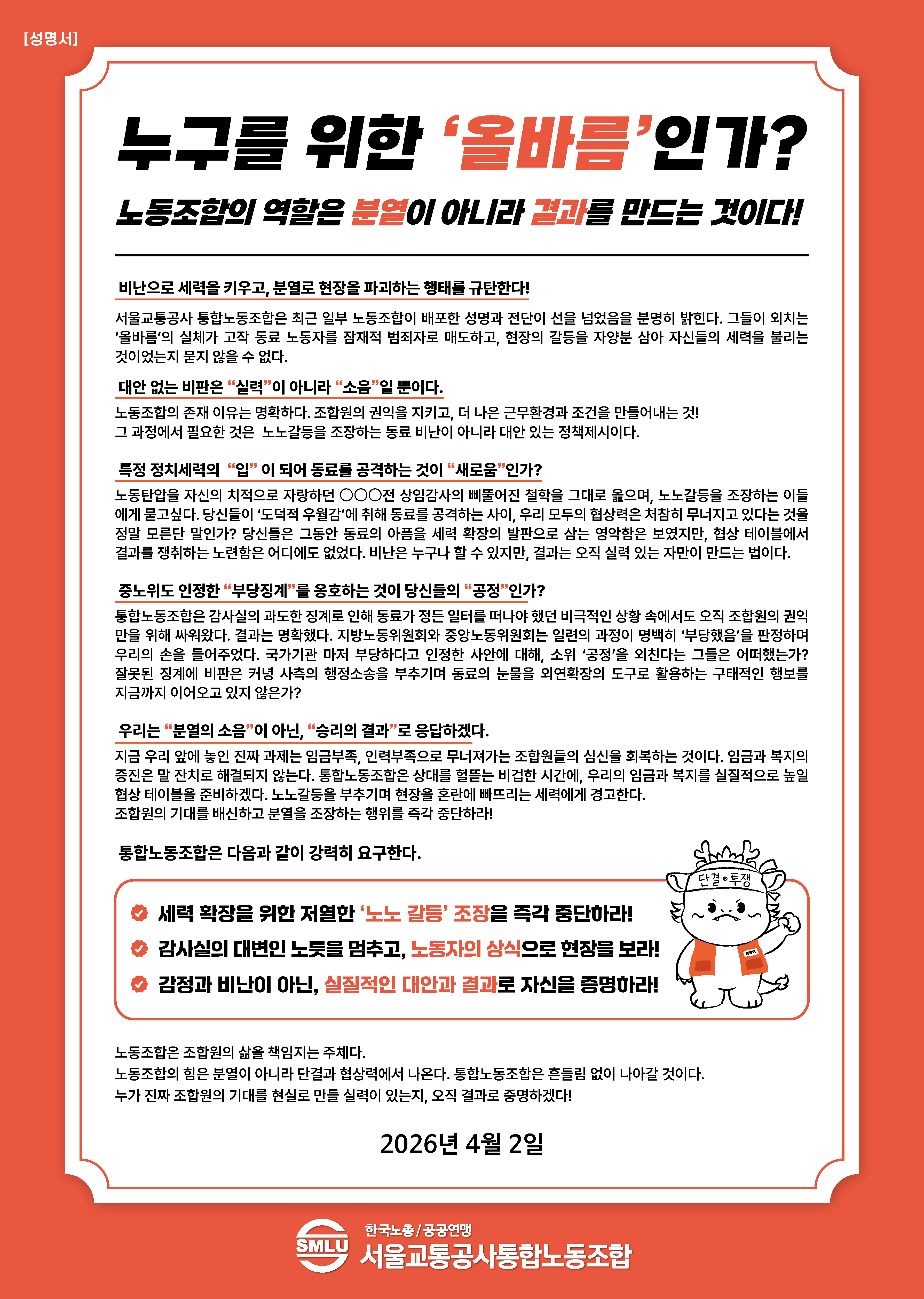 [성명서] 서울시는 서울교통공사 사용자로 나…